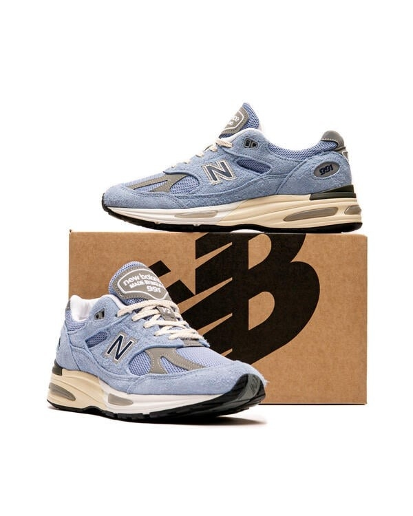 Sapatilhas New Balance 991 com design clássico em tons de cinzento e azul. Modelo icónico fabricado no Reino Unido com tecnologia ABZORB para máximo conforto e suporte.
